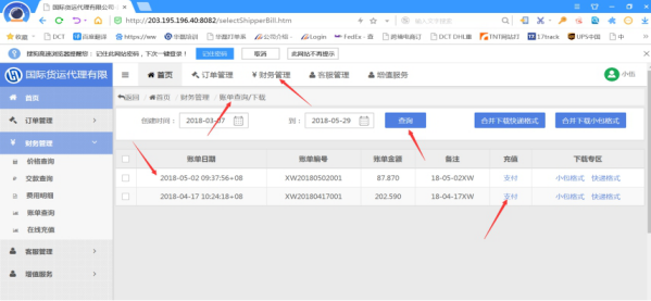 2. 进入后找到财务管理---账单查询,再根据日期可以下载每天的账单,并点击支付,进入支付当天的费用,
